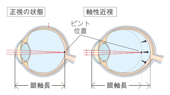 子どもの近視は、目の奥行きが前後に伸び、眼球が少しずつ細長い形になることで起こります。近くを見る時間が長くなる生活が続くと、近視になりやすくなります。一度伸びてしまった目の奥行きは、残念ながら元に戻すことができません。