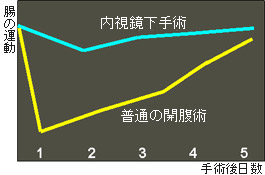 動物を使った実験でも、腹腔鏡手術は早期に腸管運動が再開し、腸そのものの浮腫みも発生しにくいため運動、吸収の面でも優れていることが証明されています。
