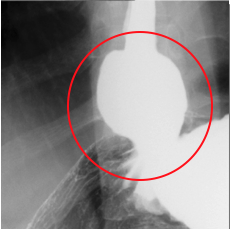 検査をすると、胃と食道の境目がゆるくて胃の一部が食道側に飛び出し(図1)、(図2)。一度胃に入ったバリウムが食道に戻ってきます(図3)。