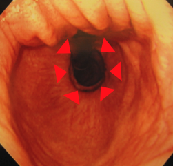 胃の中から、胃の入り口を見上げた写真です。本当は締まってなくてはいけない胸とお腹の境い目が大きく開いています。