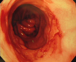 胃カメラ検査でも胃と食道のつなぎ目に近い食道粘膜は、ほぼ全周にわたって赤くただれ、粘膜が剥がれ落ち、潰瘍を作っていました(右図)。この潰瘍からは悪性の細胞は見つからなかったので、胃酸が逆流してできた潰瘍と考えられます。