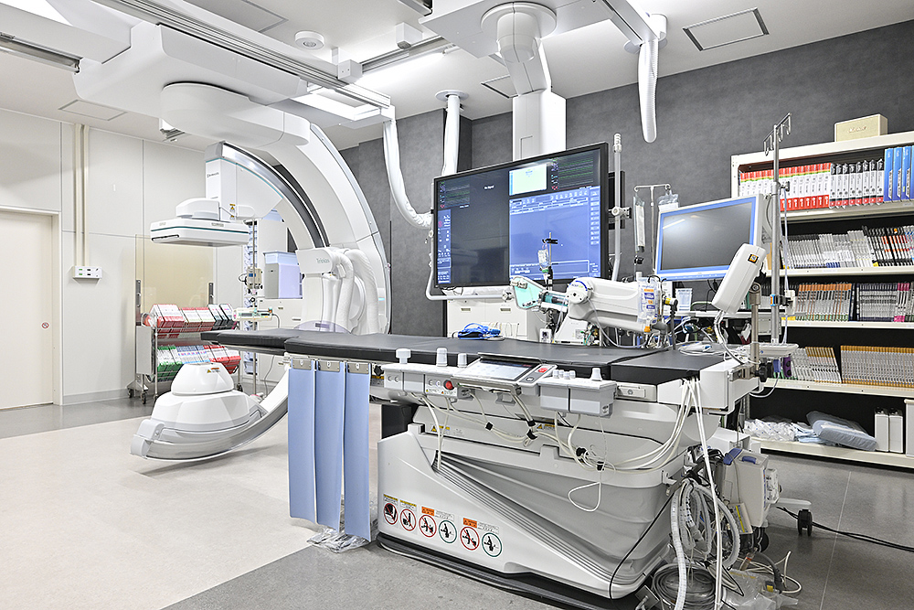 PHILIPS社製の「Cardiovascular X-ray AlluraXperFD20」を導入、心臓をはじめ四肢や腹部の血管の診断や治療を行っています。この血管造影X線診断装置は、大型マルチモニター(56型)の多彩なレイアウトにより、微細な血管やステント、コイル栓塞物質を繊細に描出することができます。また、広範囲での撮影ができ、被ばく量、造影剤量を最小限に抑えながらも、高画質に撮影することができ、診断や治療の向上につながっています。
